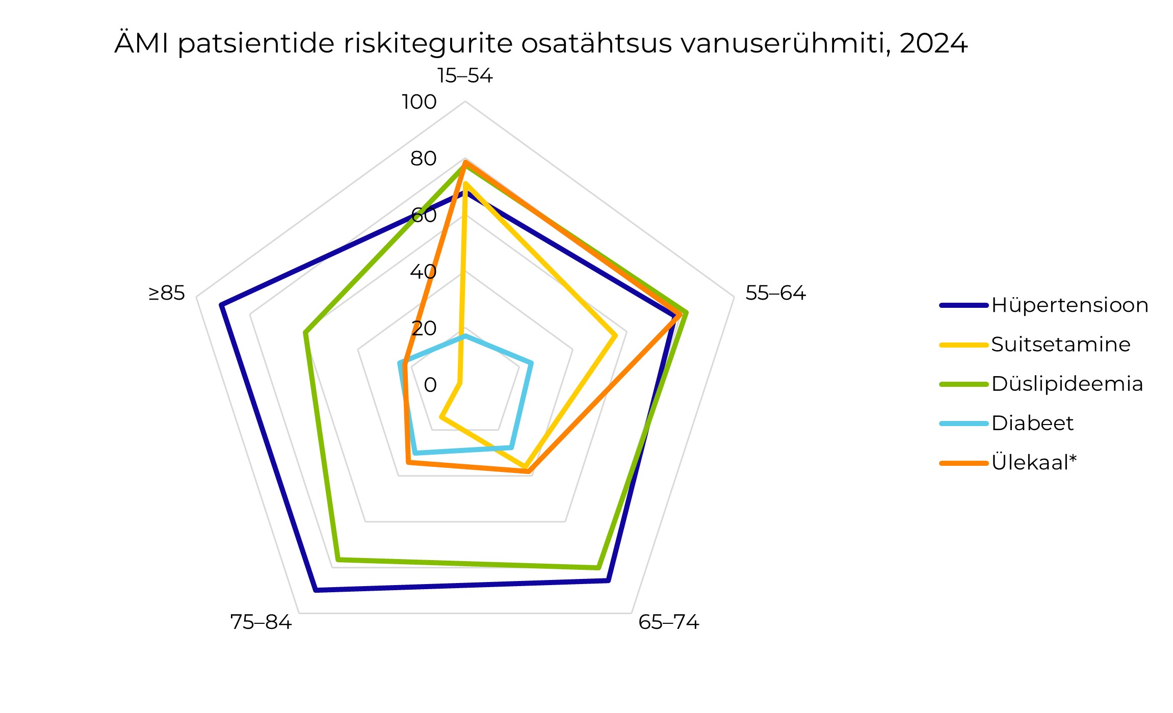 Müokardiinfarktiregistri 2024. aasta andmetel oli teadaolevatest riskiteguritest sagedaim kõrgvererõhktõbi ehk hüpertensioon, esinedes kahel kolmandikul alla 55-aastastest haigetest kuni üle 90% 85-aastastest ja vanematest. Kolmveerandil ÄMI haigetest oli lipiidide ainevahetushäire. Suitsetajaid oli kolmandik, sealhulgas alla 55-aastastest suitsetas üle 70%.