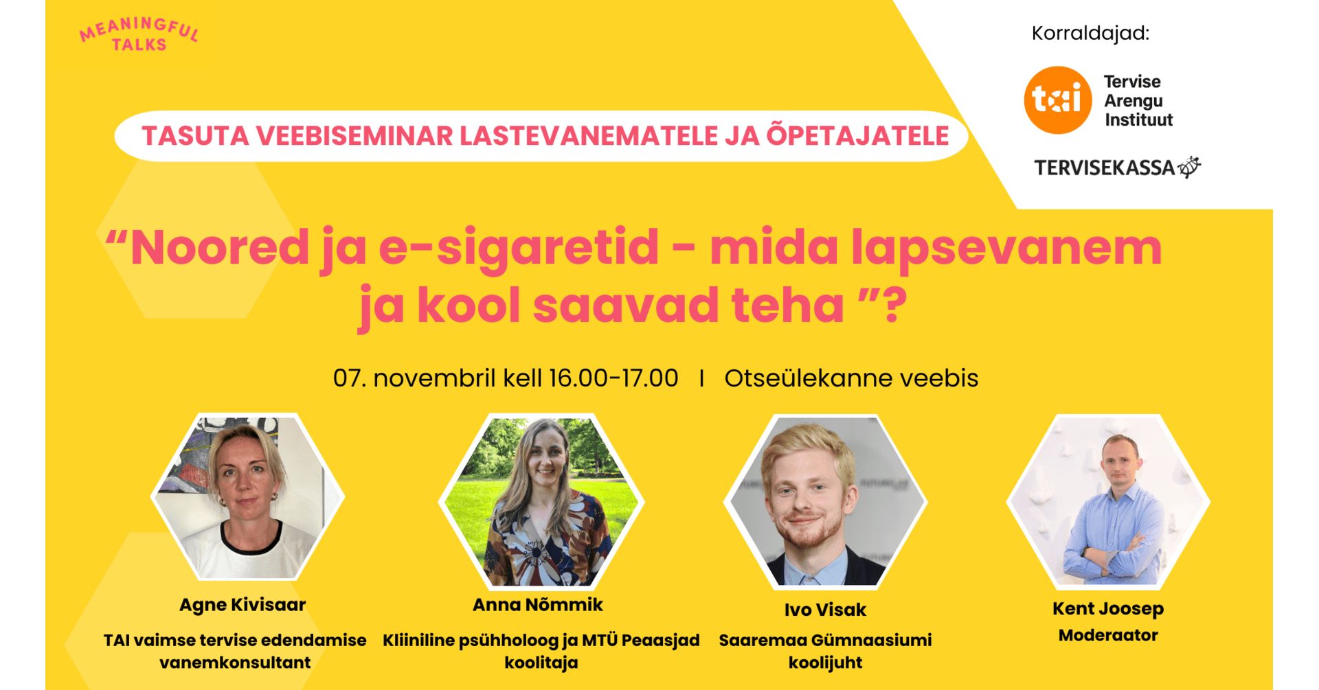 Ootame huvilisi kuulama 7. novembril vahemikus kell 16.00–17.00 veebiseminari teemal „Noored ja e-sigaretid – mida lapsevanem ja kool saavad teha?“.