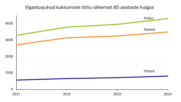 Kõikidest vigastusjuhtudest moodustasid 44% kukkumised. Võrreldes 2023. aastaga kasvas kukkumiste arv 774 juhu võrra ning see suurenes protsentuaalselt kõige enam vähemalt 85-aastaste vanuserühmas, kus võrreldes eelmise aastaga lisandus kukkumisi 9%. Vanemaealiste kukkumised on alates 2021. aastast kiiresti kasvanud.